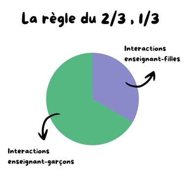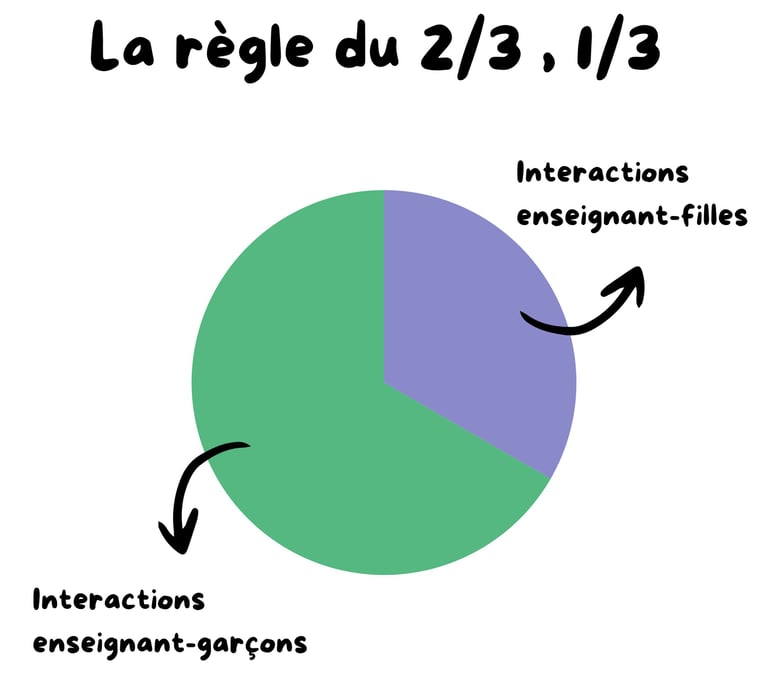 C’est la règle du 2/3 (interactions avec les garçons), 1/3 (intéractions avec les filles). Ce déséquilibre s'exprime tant sur la quantité d’interactions que sur la qualité des interactions. Les filles entendent moins leur prénom, elles sont plutôt incitées à réciter des savoirs déjà construits alors qu’on sollicite les garçons à construire de nouveaux savoirs. Ces inégalités s’accroissent avec le temps puisque dans le secondaire, les garçons ont 8 fois plus de probabilité d'intervenir de manière insistante pour obtenir la parole ou l'attention.