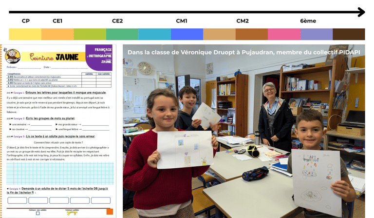 Pour cela, Véronique a développe tout un tas de ressources, qu’elle diffuse à travers l’association PIDAPI (Parcours Individualisé et Différencié des Apprentissages en Pédagogie Institutionnelle) : plans de travail, des activités en autonomie et des ceintures de compétences.