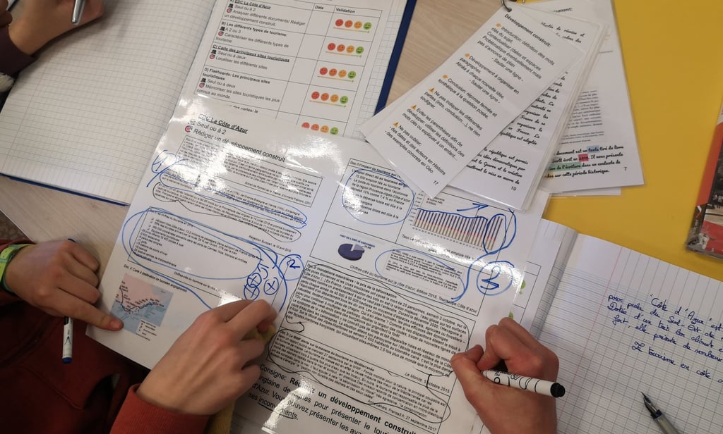 Puis chaque élève dispose de sa fiche de route, qui comprend des ateliers obligatoires à réaliser seul ou en groupe (étude de cas, analyse documentaire ou exercice de rédaction). Ils doivent la réaliser en autonomie, dans l’ordre de leur choix. Ces ateliers sont autocorrectifs.